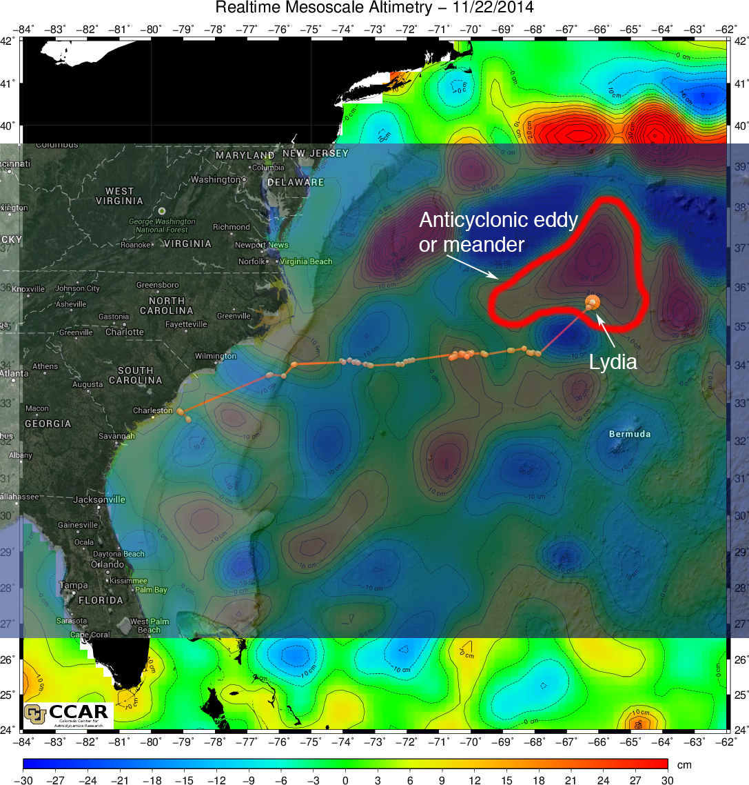 There has been lots of excitement recently about Lydia, an approximately 2,000 lbs. white shark, and her recent eastward movement offshore towards a region populated with large Gulf Stream eddies. Until yesterday, Lydia was moving mostly due east. But now, she has taken a sudden turn north. To investigate if her change in course could be cued by the presence of a particular eddy, I overlaid her track on a map of near-real time SSH (data from http://eddy.colorado.edu/ccar/ssh/nrt_global_grid_viewer).