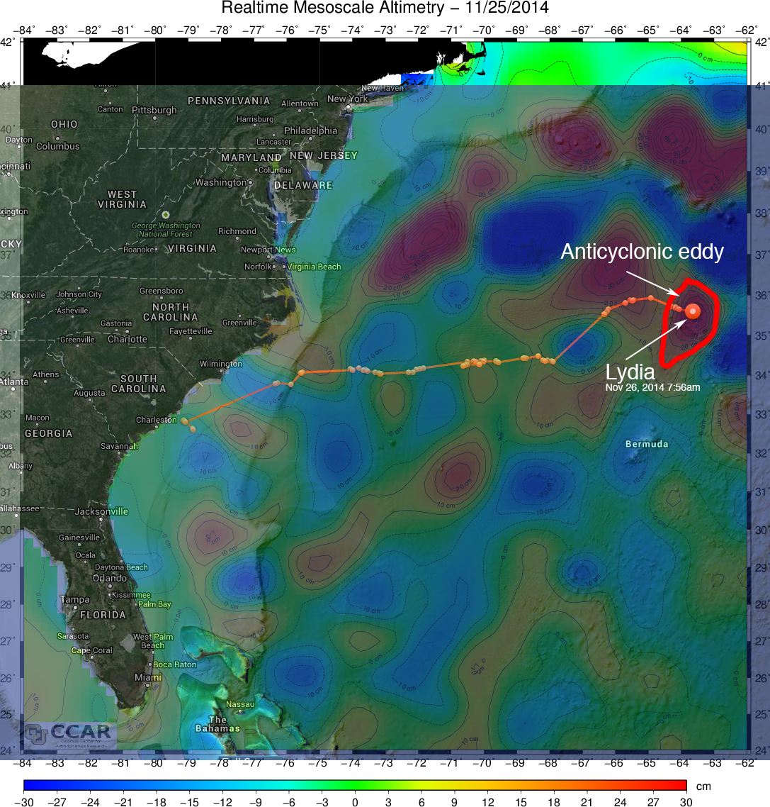 Lydia's track overlaid on a map of sea level anomaly. Anticyclonic eddies and meanders are shown as orange and red features, cyclonic eddies and meanders and blue and purple features.